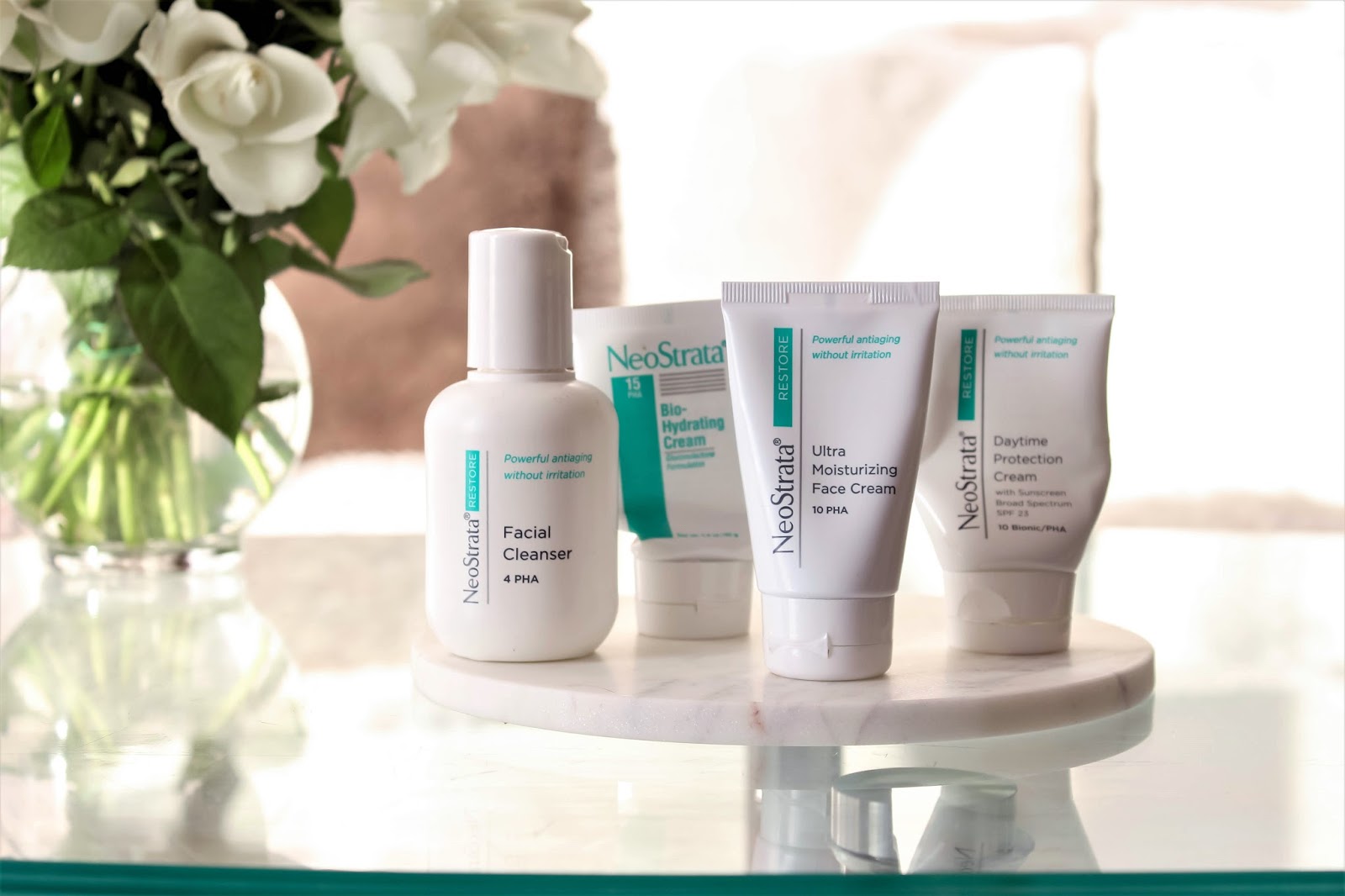 Jak už určitě mnoho z vás ví, jednou z velmi mála složek, které opravdu fungují a něco s pletí dělají, jsou kyseliny. Většina produktů Neostrata obsahuje kyseliny, přičemž každá z nich může mít jiný účel. Nejznámější jsou nejspíš AHA kyseliny – mandlová, citronová, glykolová. Tyto kyseliny způsobují exfoliaci pleti a tím její rychlé obnovování a vyhlazování drobných vrásek (glykolová), předcházejí stárnutí a ochraňují před poškození sluncem a hyperpigmentaci (citronová) a antibakteriálně působí na mastnou pokožku – snižují tvorbu mazu (mandlová). Pro mě méně známé kyseliny jsou PHA. Kyselina laktobionová pomáhá proti stárnutí pleti, hyperpigmentacím, rozšířeným pórům a působí antioxidačně. Kyselina maltobionová dokáže pleť hydratovat působí jako antioxidant a váže volné radikály, čímž působí proti stárnutí pleti.