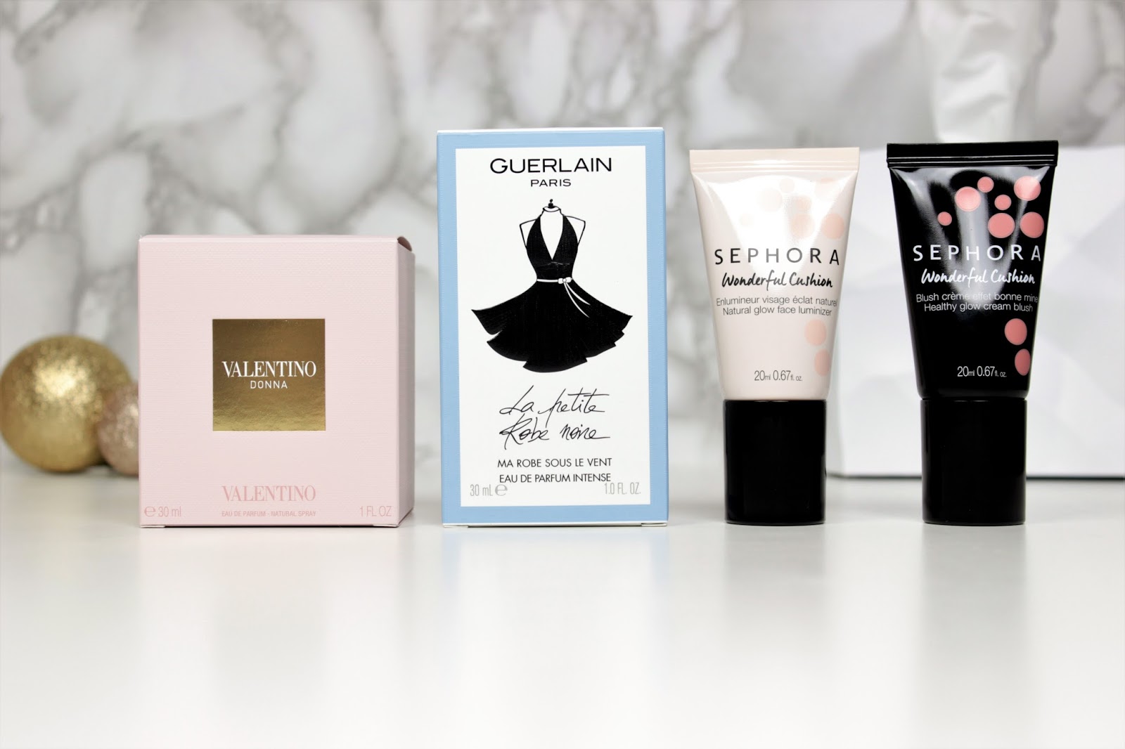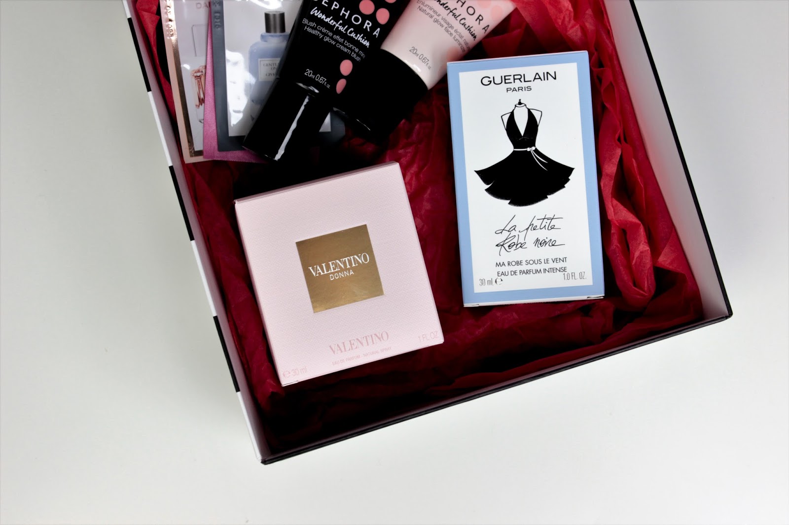 Dostala jsem pouze jeden balíček ze Sephory, ve kterém jsem našla parfém Valentino Donna a Guerlain La Petite Robe Noir Intense – novinku letošního roku. Oba jsem si moc přála a měla jsem z nich velkou radost. Stejně tak jsem si přála krémovou cushion tvářenku a rozjasňovač značky Sephora a také jsem je oba dostala. A pokud by někdo váhal, tak tenhle balíček jsem dostala od manžela. (A ten dostal před Vánoci seznam. :)) Jako bonus mi koupil naprosto úchvatné růžové huňaté ponožky, protože nic lepšího na doma snad neexistuje.
