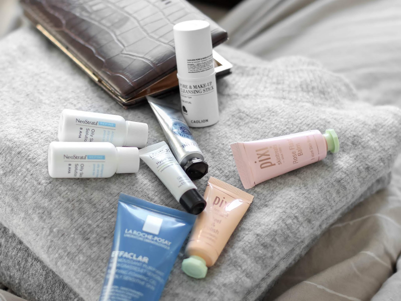 Dál beru miniatury Peel & Polish a Rose Balm od Pixi. Koupila jsem si je právě proto, abych je vyzkoušela a teď přišla jejich chvíle. Protože jsem si jistá, že na odlíčení, čištění pleti a hydrataci mi vzorečky stačit nebudou, beru ještě tuhý odličovací balzám v tyčince od *Caolion (recenze) a čistící gel od La Roche Posay.