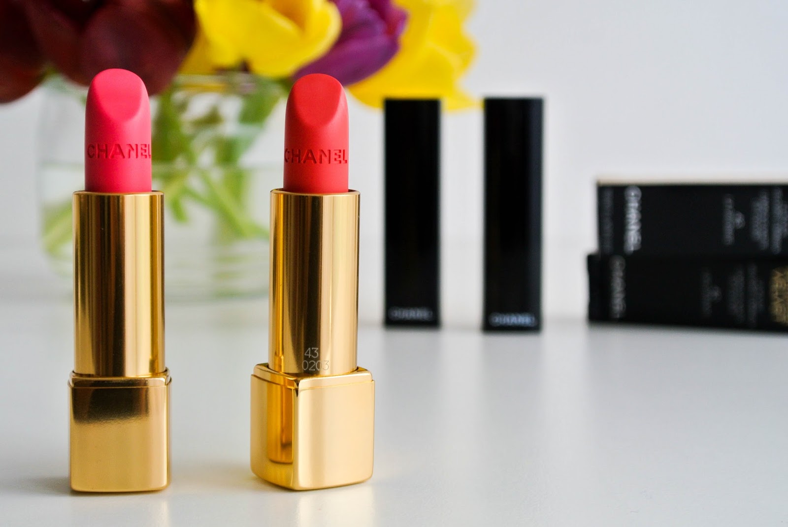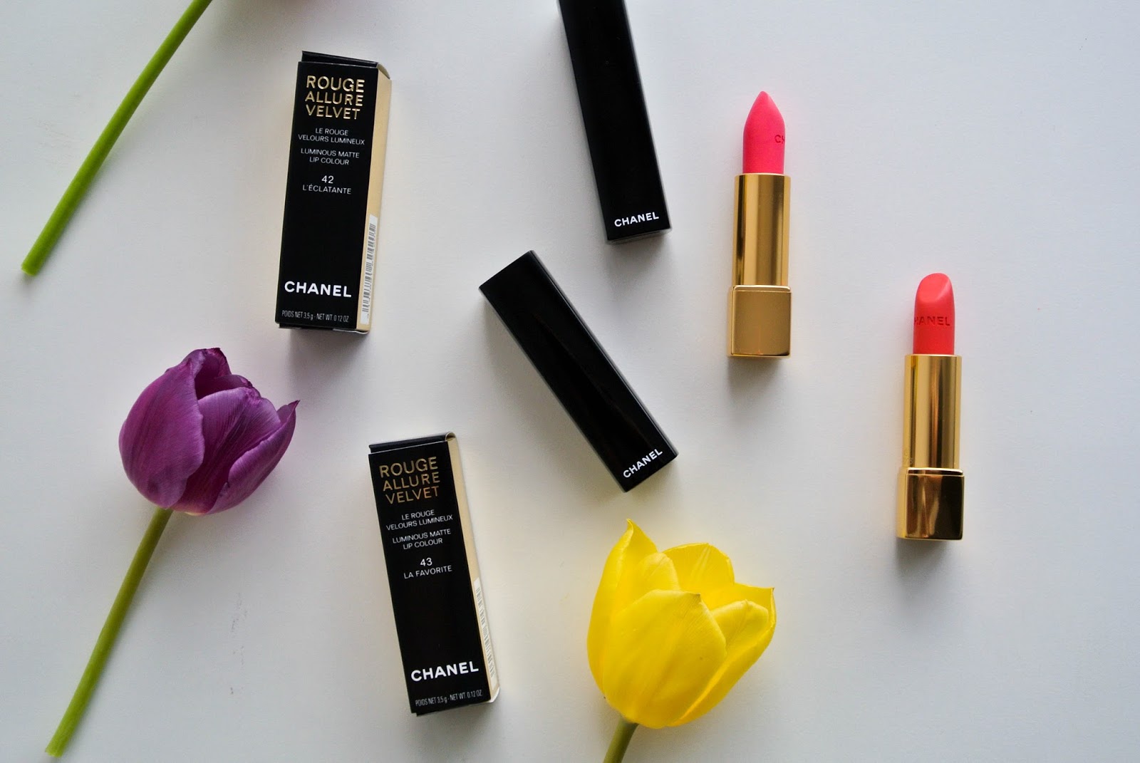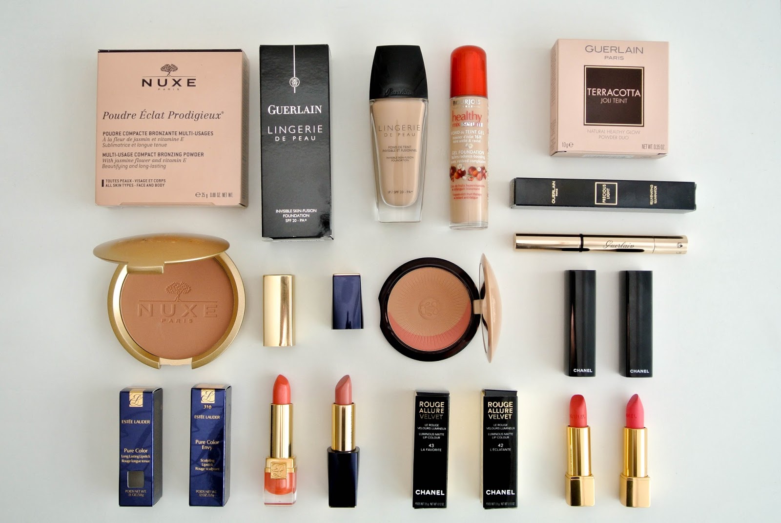 Jedna z mých čtenářek mi vřele doporučovala Guerlain Lingerie de Peau makeup (Zdravím Lenko! :)) a tak jsem se rozhodla ho zkusit. Bohužel se obávám, že je odstín 03 Beige trochu víc růžový, než jsem čekala a než bych chtěla. Nákup jsem završila dvěma matnými rtěnkami od Chanelu Rouge Allure Velvet v odstínech 43 a 42 a dvěma rtěnkami od Estée Lauder. Konrétně jsem si vzala Pure Color v odstínu 25 Melon Shimmer a Pure Color Envy v odstínu 310. Samozřejmě vám někdy v budoucnu ukážu rtěnky i na rtech. 🙂 V neposlední řadě pak rozjasňující pero od YSL Touche Eclat, které jsem zmiňovala výše. Přišlo mi v nějakém z prvních balíčků hned zkraje měsíce a mám odstín 02.