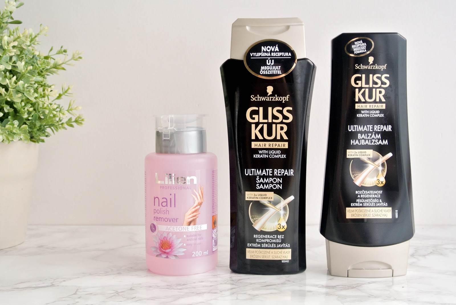 Minulý víkende jsem také navštívila „vesnickou“ Tetu v Broumově, kde jsem byla na víkend na svatbě mé švagrové. Snad nikoho neurazím, když řeknu, že výběr opravdu zoufalý. Asi jsem zhýčkaná všemi možnými obchody na každém kroku. Praha no. 🙂 Každopádně jsem si mylně myslela, že vlasy umyté v pátek ráno mi do soboty vydrží. Nevydržely a já jsem tedy skočila pro šampon a kondicionér Gliss Kurr Ulimate Reapir, protože ty už jsem kdysi měla a byly vcelku dobré. Z dalších zapomenutých kousků jsem vzala ještě odlakovač na nehty, a pinzetu, kterou ovšem nemohu najít. 🙂