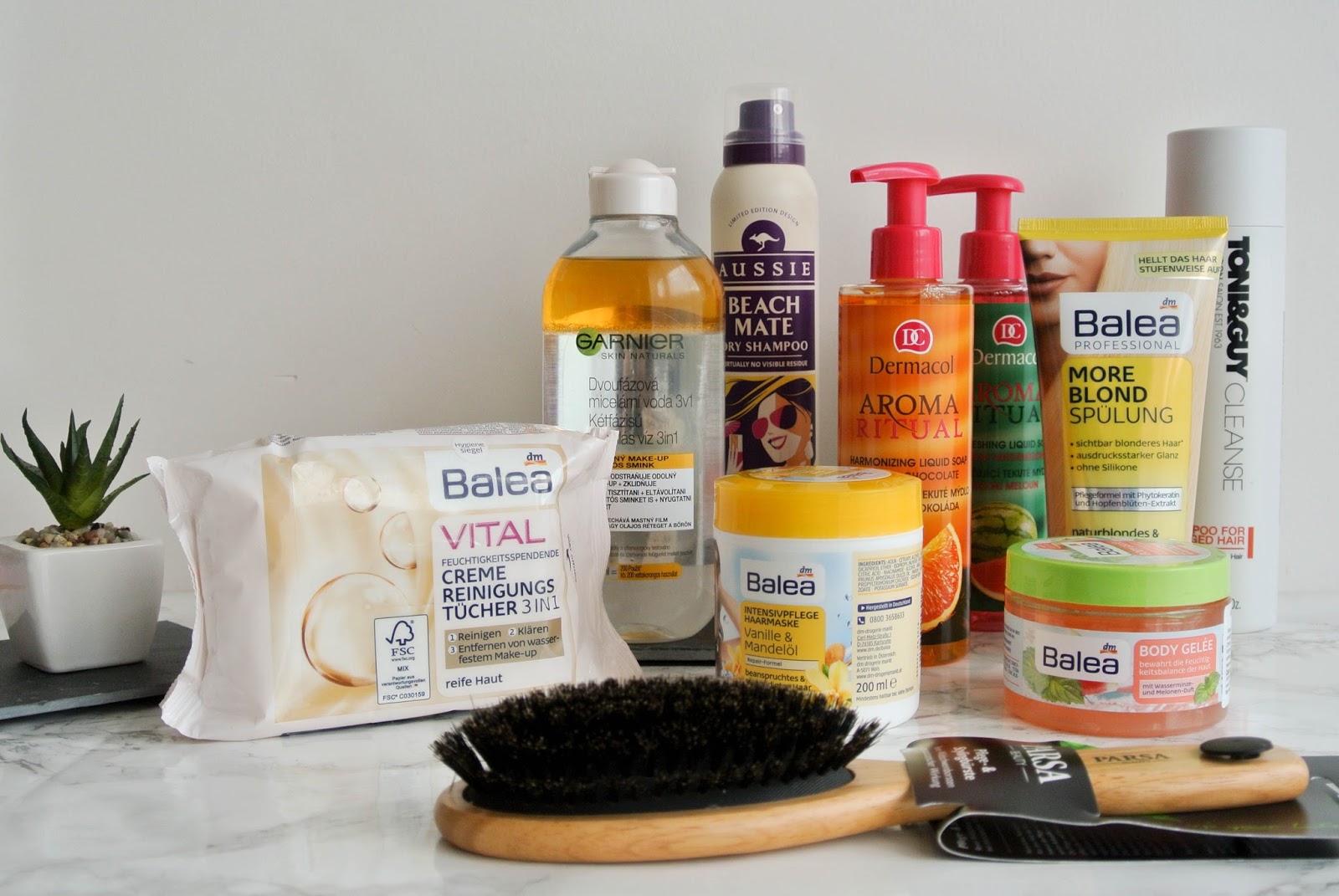 Pokaždé když jdu do drogerie, odnesu si nějaké produkty na vlasy. Ani nevím proč, ale prostě se to vždycky stane. Od značky Parsa jsem vzala kartáč s kančími štětinami a vyměním ho za ten co mám teď. Ten nemá totiž jen kančí štětiny ale i plastové hroty s kuličkou, které se vytrhaly a teď kartáč škrábe. Aussie suchý šampon je celkem známá věc, přesto jsem ho nikdy neměla, protože stále dokola kupuji Batiste Chtěla jsem ho tedy zkusit. Dodělala jsem i svůj oblíbený šampon a protože nebyl čas na objednávání z internetu, vzala jsem Toni&Guy, který má být hydratační. Při nějaké z dalších návštěv jsem si vzala ještě hydratační masku a balzám na blond vlasy od Balea. Kupodivu dělá Balea super a kvalitní věci na vlasy a to doslova za pár korun.