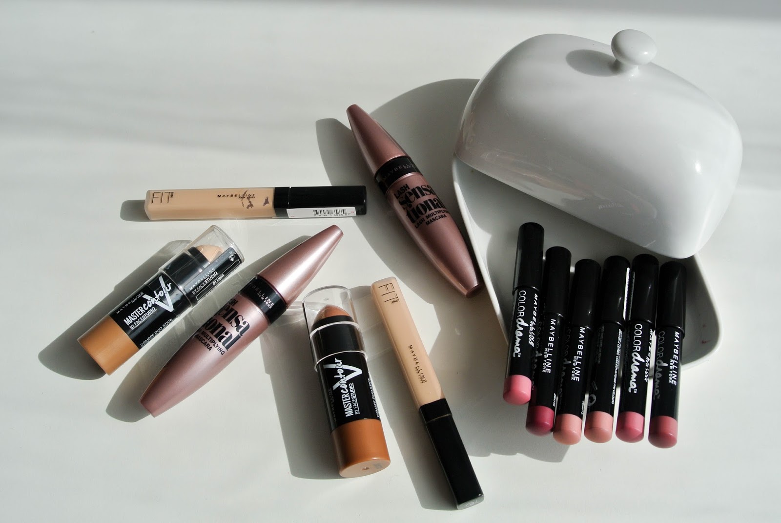 Konečně se tedy dostáváme k dekorativní kosmetice. Při návštěvě drogerií jsem také dokoupila pár výrobků Maybelline, jak k recenzi, tak pro vás do proběhlé giveaway. Pár kousků jsem také kupovala na krasa.cz, kde probíhala akce 1+1 zdarma právě na Maybelline. Škoda, že už jsem většinu věcí měla koupených, protože jsem mohla buď ušetřit, nebo vám toho koupit víc. Každopádně jsem koupila několik odstínů Intense Velvet Lip Pencil, Konturovací tyčinku 2V1 v odstínech light a medium, tři řasenky Lash Sensational a dvakrát korektor Fit Me. Na recenzi korektoru se můžete těšit v dohledné době. 🙂