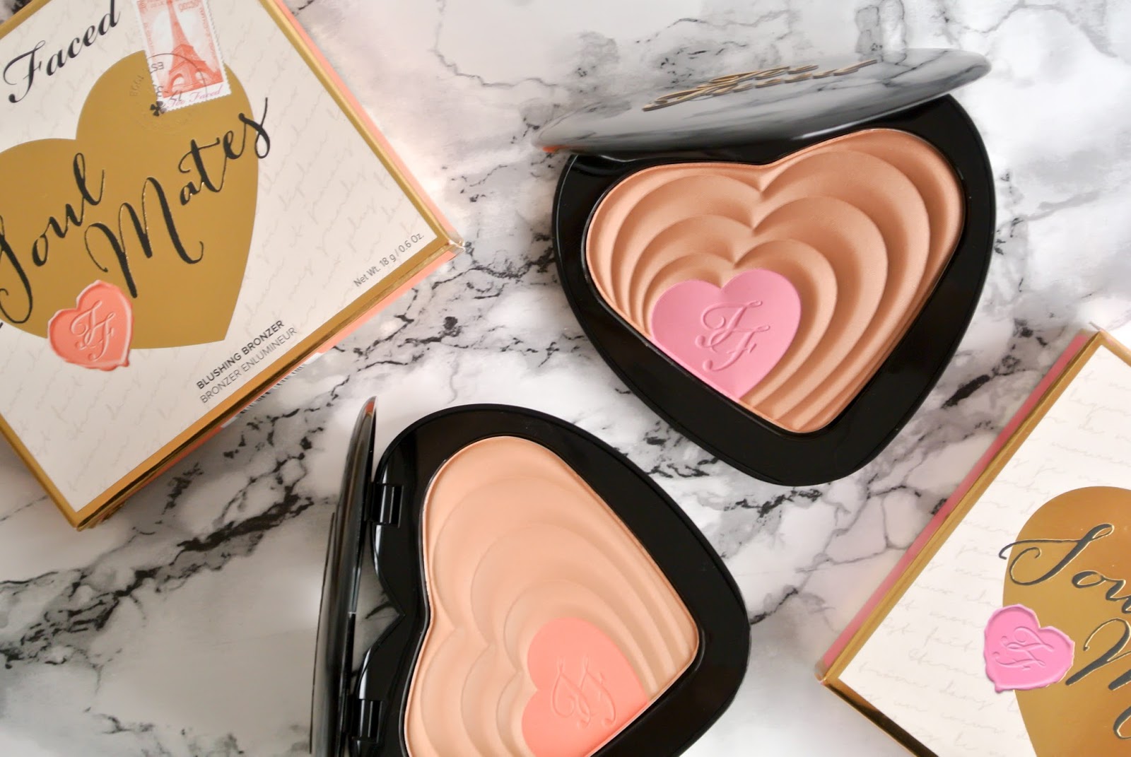 Při nakupování maličkostí na webu Dekorativka.cz jsem si všimla, že mají mezi novinkami dva bronzery od Too Faced – Soulmates. Vzala jsem obě verze Carrie & Big a Ross & Rachel. Odkaz na moje dva oblíbené seriály necháme stranou a přesuneme se k lehké kýčovitosti balení, které tento měsíc započalo duem bronzerů a tvářenek v srdíčkovém obalu a skončilo tyčinkou s pandou. Osobně bych tyhle Too Faced srdce duem bronzer & blush nenazvala, protože srdíčka s tvářenkou jsou příliš malá na to, aby se dala nabrat samostatně. Pro mě fungují perfektně i smíchané a trochu barvy do bronzeru mi nevadí.