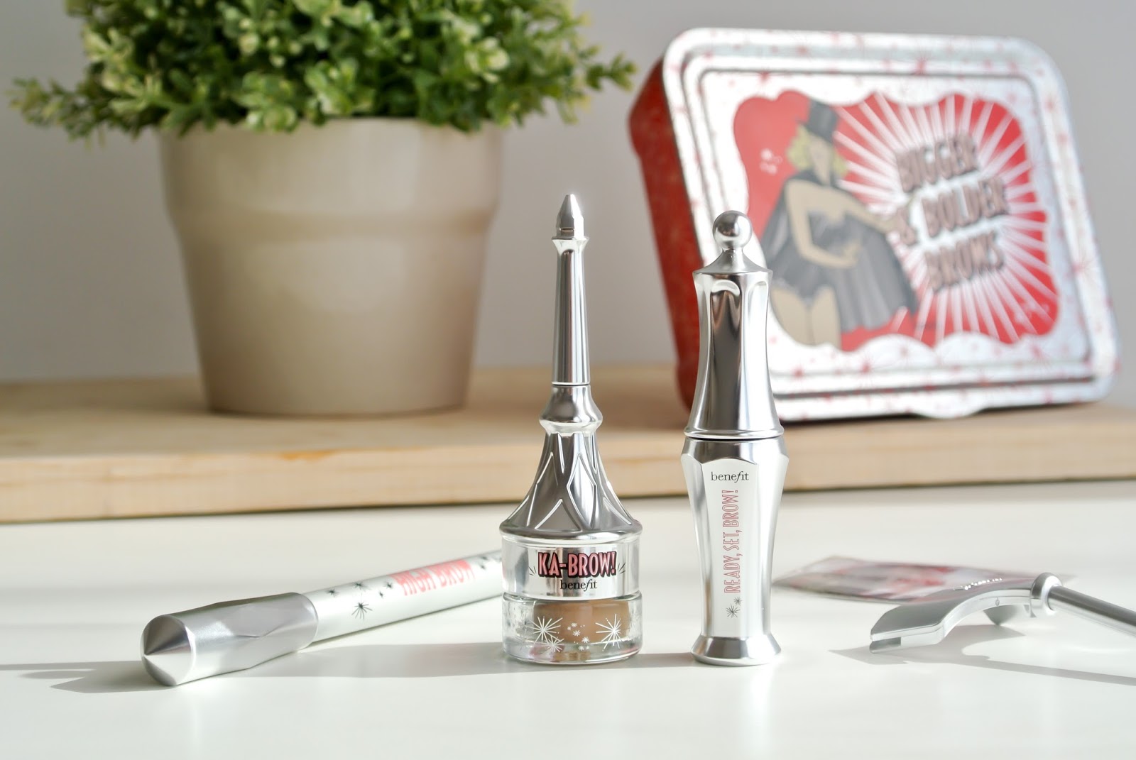 Mně konkrétně padl oka set Bigger & Bolder Brows, který obsahuje Ka-Brow, gel v kalíšku, High Brow, tužku pod obočí a Ready Set Brow, průhledný gel na obočí v cestovním balení. Šablony na obočí a malé držátko na ně je sice roztomilá věc a doplňuje se s hezkou kovovou krabičkou ve které jsou produkty uloženy, nicméně já jsem zvyklá dělat si obočí klasicky ručně, a proto jej nevyužiji. Dalším produktem, který není v žádné sadě, je Gimme Brow a ten jsem si vzala v odstínu č. 1. Abych nezapomněla, k nákupu dvou produktů Benefit byl jako jako dárek miniatura řasenky Roller Lash.