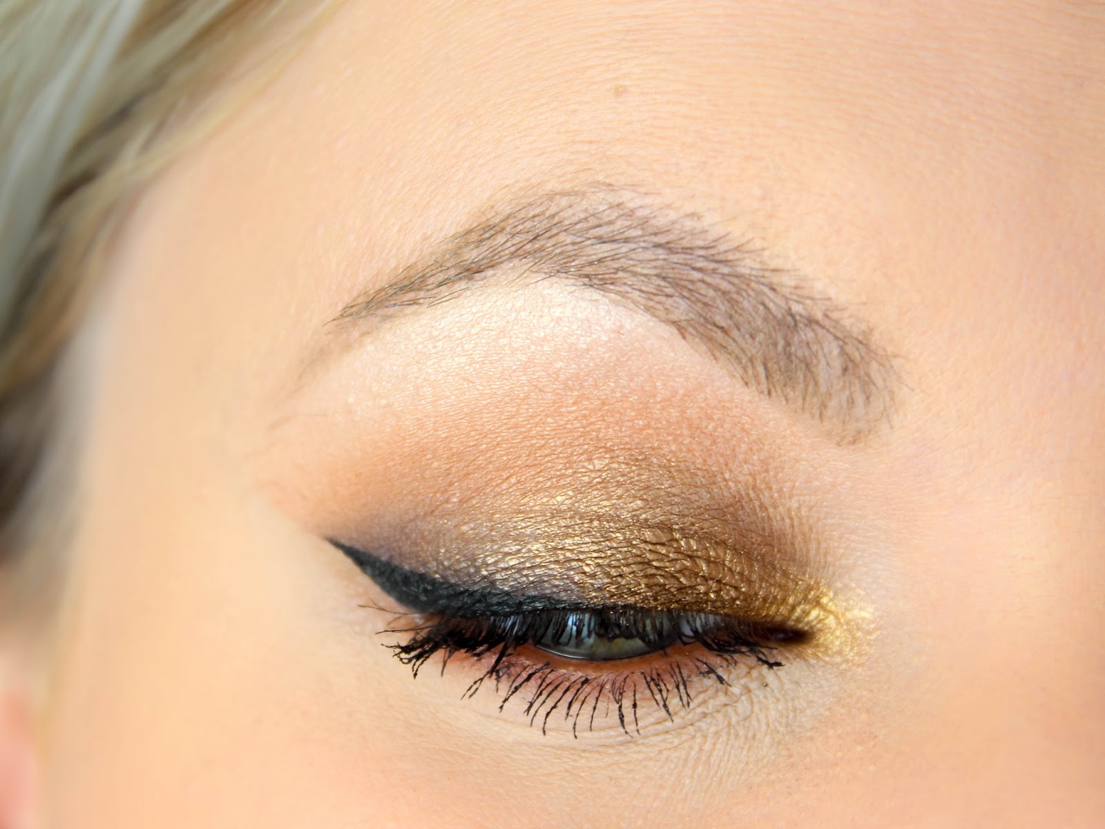 Vnější koutek jsem ztmavila nádherným matným čokoládovým a relativně neutrálním odstínem z paletky (Montaillou). Ten jsem kromě vnějšího koutku stáhla směrem k řasám jako bych kreslila linku, čímž jsem ztmavila linii řas zhruba do středu víčka. Linky většinou nedávám příliš blízko k vnitřnímu koutku, abych si opticky nezmenšovala oko, pokud tedy nedělám klasické smokey eyes, tam pak linka samozřejmě patří. 🙂 Přes celé víčko jsem plochým navlhčeným syntetickým štětcem rozprostřela bronzovo zlatý stín (Versailles) a do vnitřního koutku jsem dala teplou zlatou a lehce ji rozetřela směrem na pohyblivé víčko (Privilege). Všechny přechody při líčení pečlivě rozmazávám a používám k tomu štětec s předchozí světlejší barvou, nebo čistý štětec.