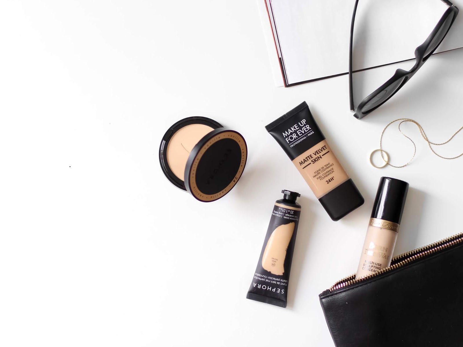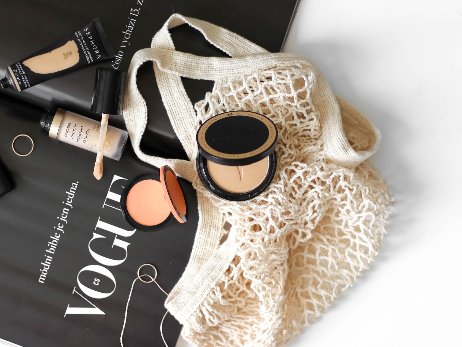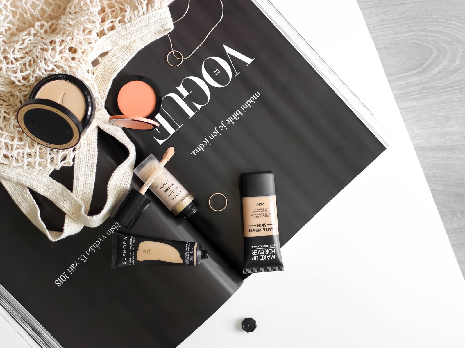 tvářenka Sephora N°15, Too Faced korektor Snow, MUFE Velvet Skin Y315