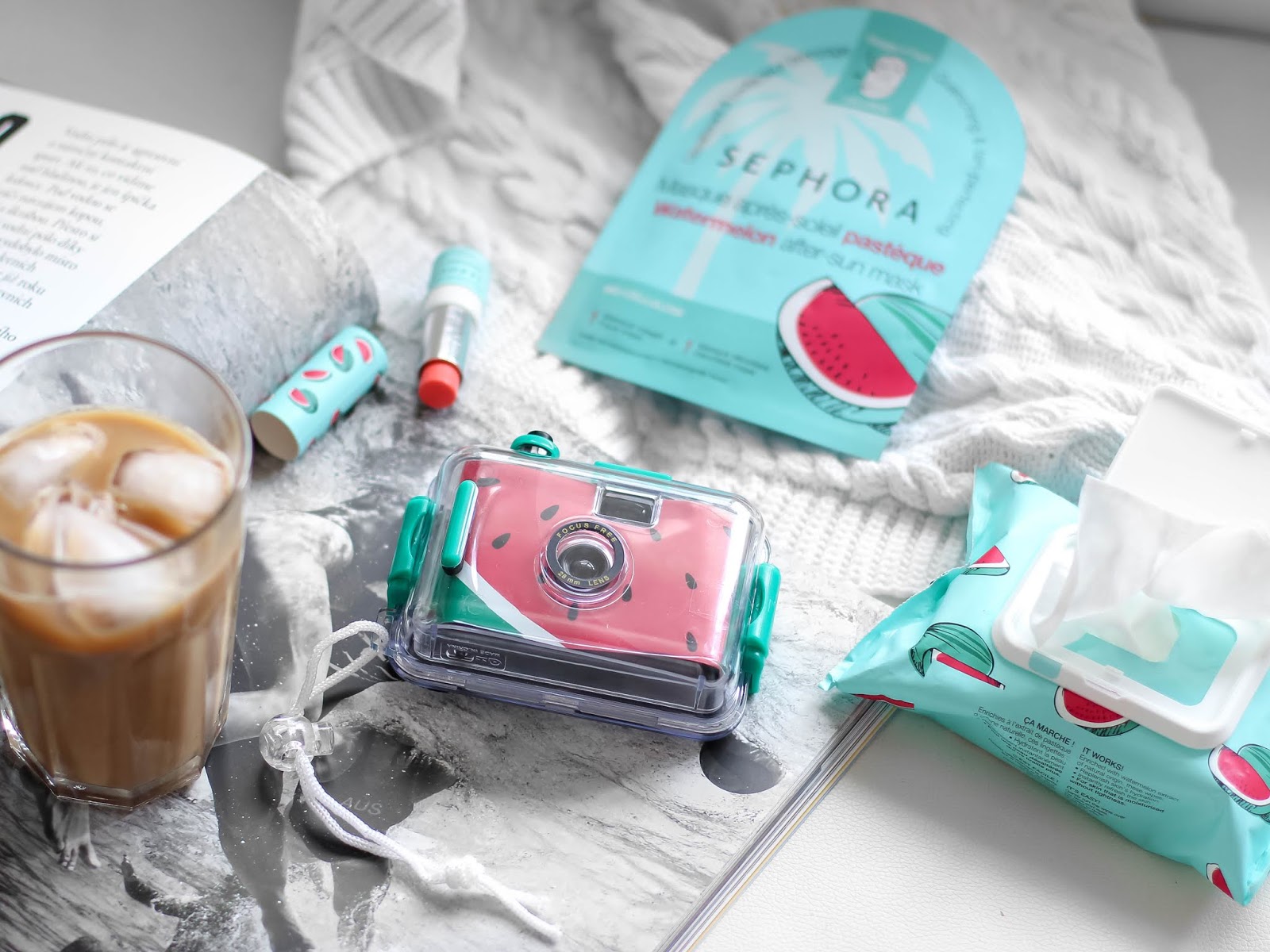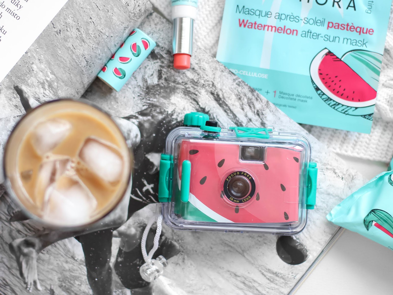 Součástí melounové řady je i *melounový balzám na rty, kterých není nikdy dost a tyhle ze Sephory jsou příjemné a *melounová maska po opalování, která je plátýnková, krásně voní a je na dvě části – na pleť a na dekolt. Už jsem ji konečně vyzkoušela, i když jdu tak trochu s křížkem po funuse, ehm, a je na pleti příjemná, chladí, trochu zklidňuje a lehce hydratuje. Po opalování ideální. Navíc, masek na dekolt jinak moc neseženete. Spolu s melounovou kolekci mi dorazil i melounový foťáček, který má vodotěsný case, ale ten jsem bohužel nikde v Sephoře nenašla a nevím, jestli vůbec šel koupit.