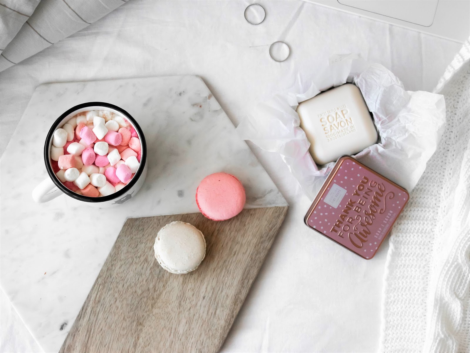 Nakonec jsem do balíčku přihodila ještě mýdlo, tentokrát s vůní růží. Vzala jsem si tohle kouzelné mýdlo v krabičce i minule a byla jsem z něj nadšená. Nejen že krásně voní a je velmi jemné, ale plechová krabička pak může zůstat na další použití a dělá z mýdla hezký dáreček. Během focení jsem si udělala autentickou atmosféru a celým pokojem mi voněla horká čokoládu z plecháčku a syn Alex ujídal marshmallowny. Úplně jsem se díky tomu začala těšit na Vánoce. 🙂